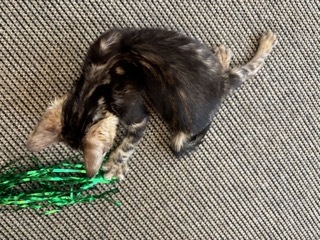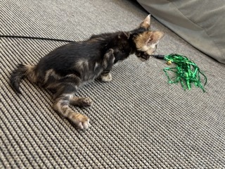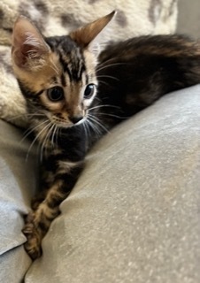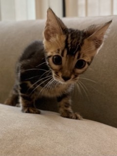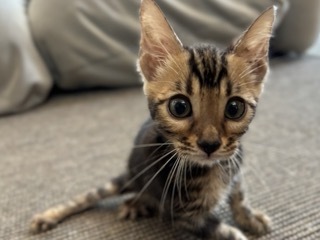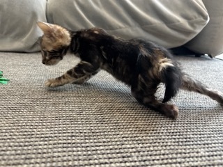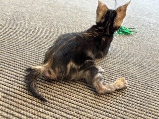 | 特徴(性格など) | 活発でお顔立ちも可愛い、ベンガル ブラウンマーブルタビーの女の子です。 先天性による原因かどうかは不明ですが、下半身が弱く後脚をうまく使えません。 ですが力強く蹴って歩行し、他の猫とも活発に遊び元気に走り回っています。 人にもよく慣れています。 少しずつ脚力も付き力強くなってきていますが、将来的にどこまで良くなるのか、あるいは悪化するのかわかりません。 自分で食事や排尿もできますが、尻尾や後脚が汚れやすいのでお世話が必要です。 |
