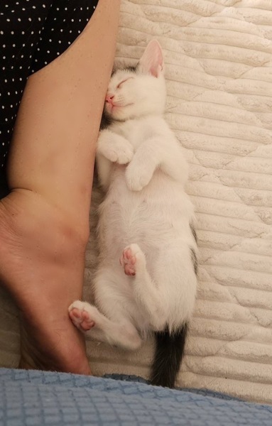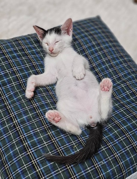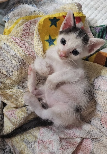 | 特徴(性格など) | ・とても元気 ・人懐っこい ・甘えん坊 ・模様が個性的(白地に黒で、背中にサッカーボールのような柄、首の後ろにはハートのような柄) ・現在、預りボランティアさんのお家で先住猫さん達に遊んでもらいながらスクスク成長しています。 |