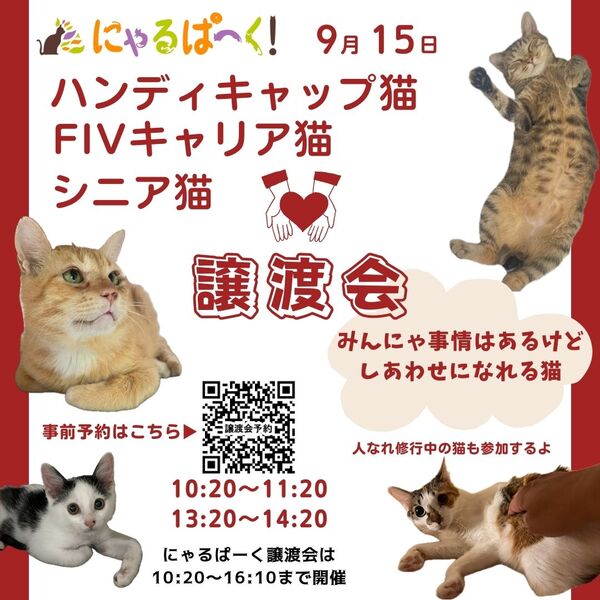 | その他(譲渡条件など) | 基本的には定期的に開催している譲渡会にて、 猫と触れ合っていただきながら面談させていただければ と思います。 個別お見合いも可能ですので、まずはご相談ください。 譲渡にあたっては ・トライアル(お試し飼育) ・譲渡費用のお願い ・契約書記入 このような流れをお願いしております。 お問合せ、お待ちしております! 【譲渡会情報】 9月15日(日) 緑区なるぱーくで開催される にゃるぱーく!猫まつり譲渡会に参加します。 こちらは事前予約可能です ハンディキャップ猫の譲渡会の時間もあります。 事前予約フォームは以下のリンクより https://forms.gle/rwtuHem2eYmxwhrDA 気になる猫さんがいたら お問い合わせもお気軽に⭐︎ |