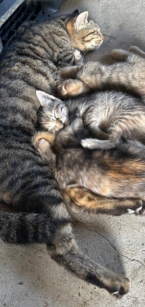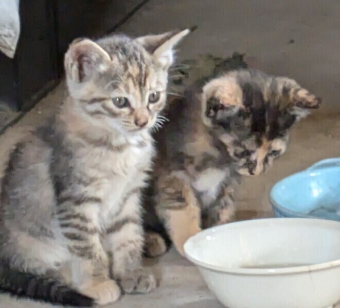 | 特徴(性格など) | 母猫はキジトラですが、三姉妹?のうち一匹だけサビちゃんです。 顔に黒いポツポツがあるのが個性的。良くも悪くも野良猫って感じです。 でも、目がくりくりで、かわいらしい顔をしています。 少し前はすぐ隠れて臆病な感じでしたか、最近、2匹が里親に引き取られて行ったので、警戒心Maxです。 たくさん食べ、スクスク育っています。 |