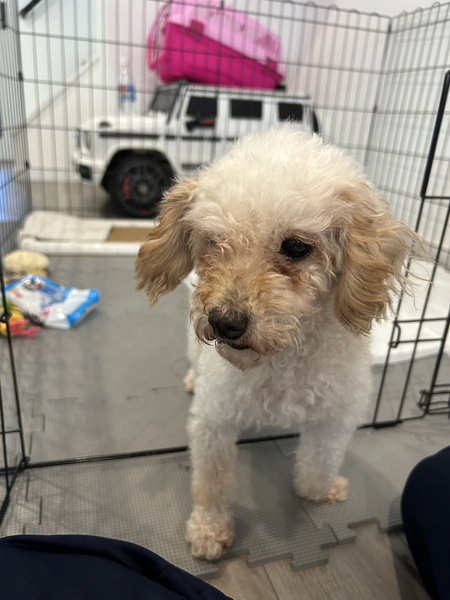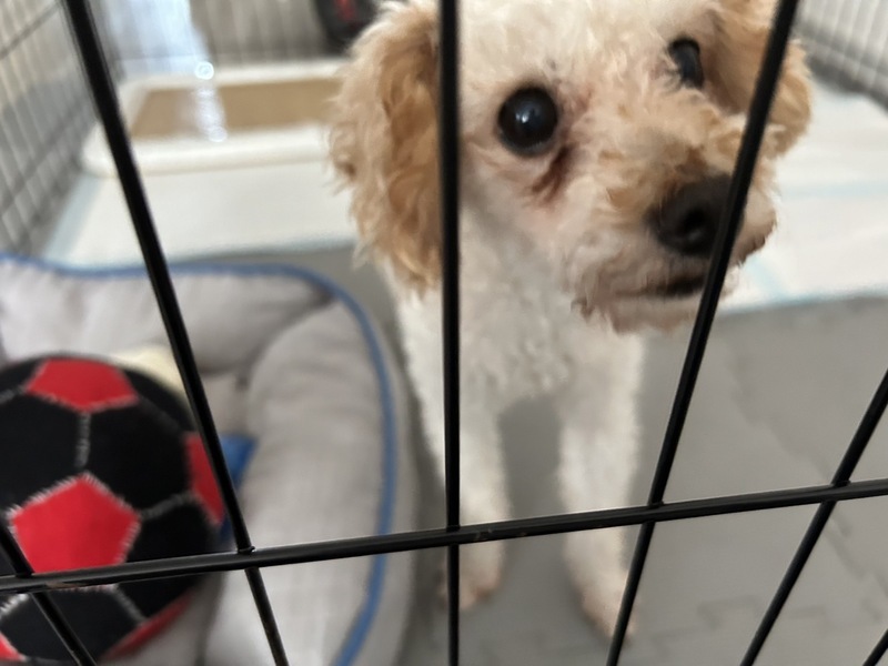 | 特徴(性格など) | クリクリヘアーの懐っこいトイプーさん 毛色はホワイトで、耳だけ茶色いチャームポイントがあります。 繁殖引退犬です。 レスキュー後、歯のスケーリングや去勢手術をしました。 |