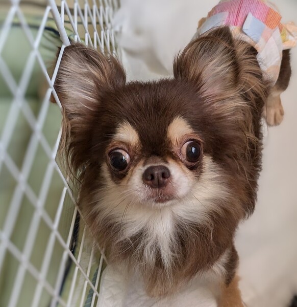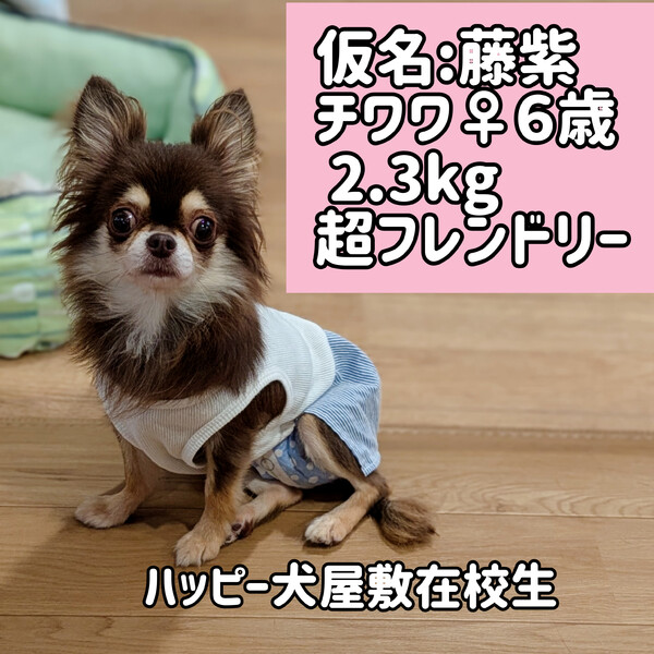 | 特徴(性格など) | こちらのフォームからのお申込みでは正式なエントリーにはなりません。 お申込みの場合は、必ず下記の「ハッピー犬屋敷」ホームページのお申込みフォームからお願いいたします。 ●仮名:藤紫(ふじむらさき) ●犬種:チワワ(ロングコート) ●性別:♀ ●カラー:チョコタン ●年齢:2018.6.25 ●現在の体重:2.32Kg ●性格:超フレンドリーです。遊ぶの大好き!好奇心旺盛でおもちゃでよく遊びます。甘えたくていつも近くにいます ●ごはん:手作り、ドライ、缶詰なんでも大好き ●お散歩:お部屋の中でハーネスを付けて歩く練習をしています ●お留守番:基本お留守番はない環境ですが、夜などはフリーでもケージでも問題なく過ごせてます。 ●トイレ:成功率高めなので今はオムツ無しで過ごしています |