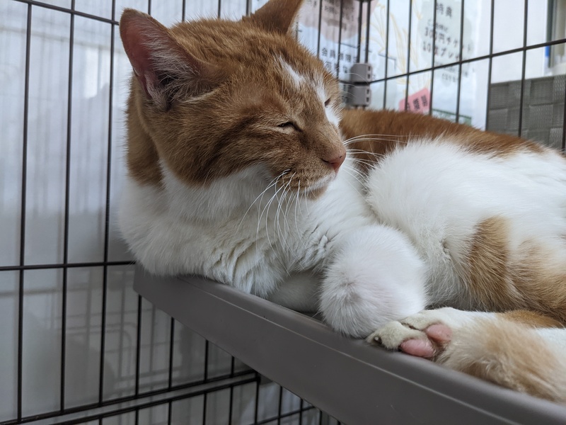 | 特徴(性格など) | 三毛猫のような雑種(ミックス)で誕生日は分かっていません。 年齢は9歳で、年齢層はシニア猫です。 体重は6.5kgです。 性格は、一人が好きとか、大人しいとか、人見知りと言われます。 当施設で人馴れのトレーニングを継続したところ、とても人懐っこい猫さんに変身しました。体をなでたりもできますし、もふもふです。ケージからも出てくるようになり、ほかの猫さんとも遊んだりしています! |