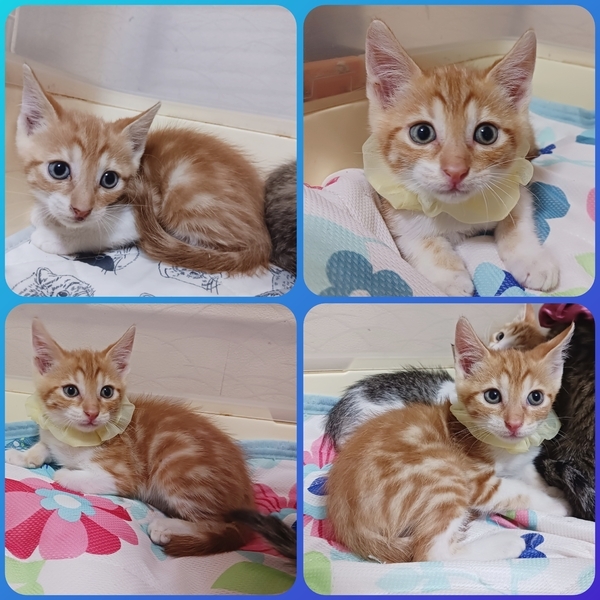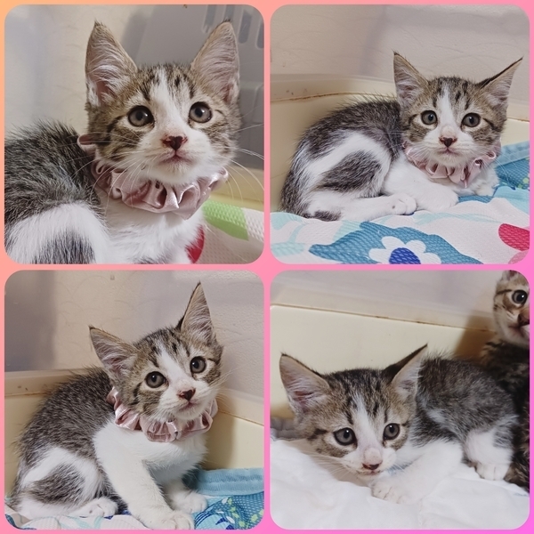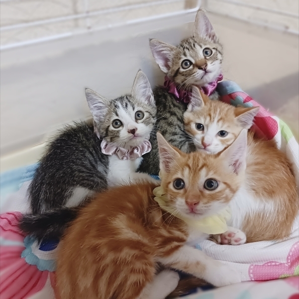 | 特徴(性格など) | ★キジ白ちゃん♀(ピンクの首輪) 兄妹の中では一番小柄ですが、一番食いしん坊で一番気が強いです。将来はツンデレ女子になると思われます。 ★茶白くん♂(黄色の首輪) 体は大きく食欲も旺盛ですが少しビビリ。 アメショ風の柄がチャームポイント! とても活発に走り回ります! ★キジちゃん♀(赤の首輪) 垂れ目気味の困り顔が超キュート! 4匹の中では一番人懐っこいです。 男の子を押しのけて我先にごはんに食いつきます! ★茶白くん♂(青の首輪) 体格は一番大きく、一番気が小さい臆病な性格ですが、噛みついたりパンチすることはありません。 |