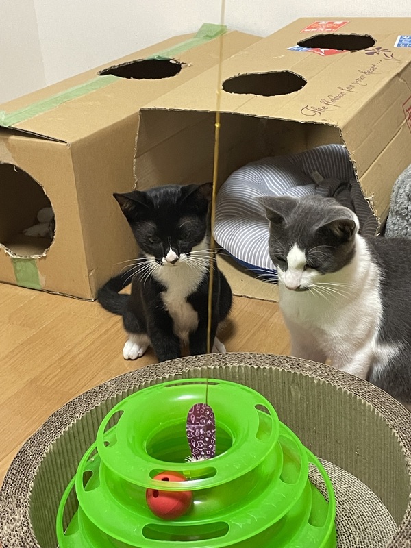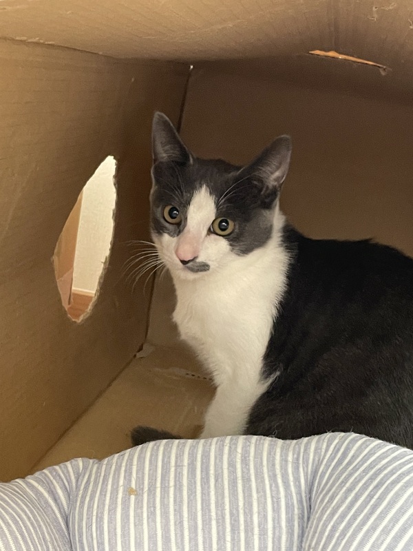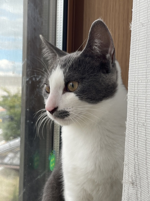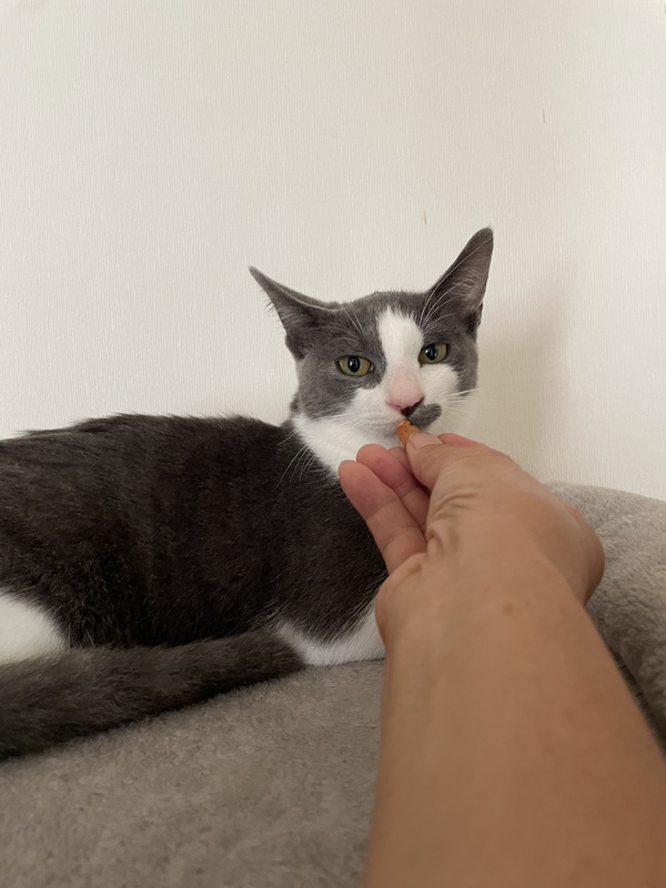 | 特徴(性格など) | 濃いグレーと白の子で手足が長くイケメン君です。 シャー言う事ありますが攻撃的なところは無く撫でたり出来ます。 おもちゃで良く遊びます。 |