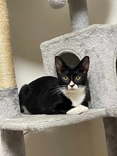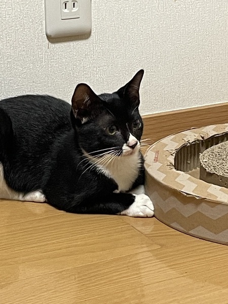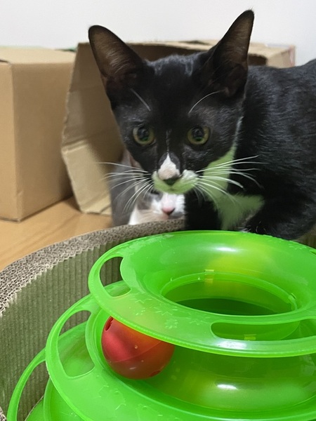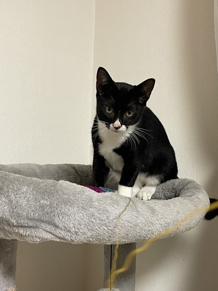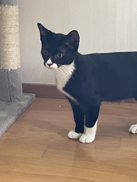 | 特徴(性格など) | 黒白の毛で毛並みがとても良く手足が長いイケメン君です。 まだシャーは言いますが攻撃的なところは無く逃げ腰ですが撫でる事も出来ます。 おもちゃでも良く遊んでます。 保護した時は目やにが出てちょっと風邪気味でしたが点眼と抗生剤で良くなりました。 ご飯も食べて元気いっぱいです。 |