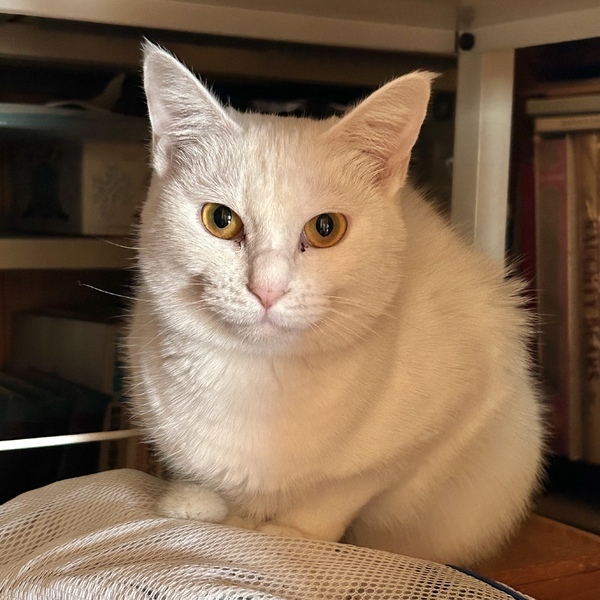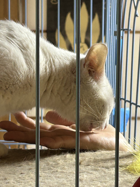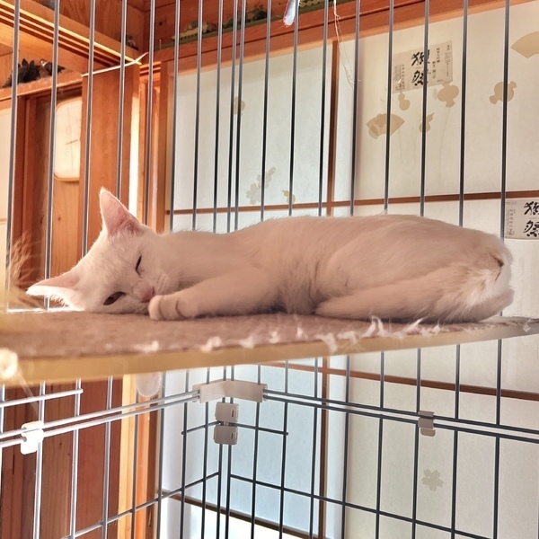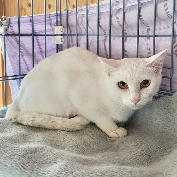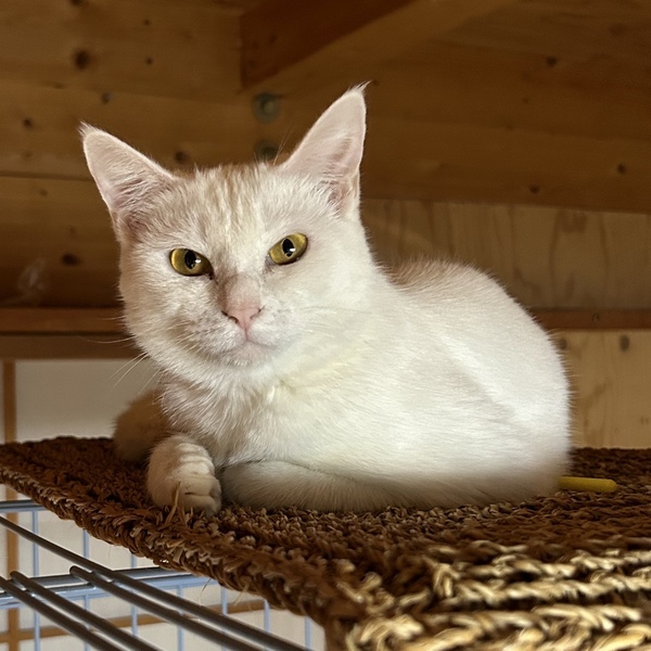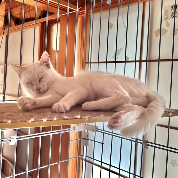 | 特徴(性格など) | 他の猫にも動じないマイペースな子です。 ひとり遊びが上手な賢い子です。 身体能力は高めです。 全身透き通るような白でしっぽはすらりと長いです。 うっすら毛に色があるので将来模様が出るかもしれません。 美しい濃い金の瞳をしています。 まだ人が少し怖いようですが、人の手からちゅ〜るは食べられます。 ちゅ〜るは大好きです。 人を警戒したいのに眠気に負けてしまうようなお茶目な子です。 シャーは言いますが猫パンチはしません。 不安になると結構大きい声で鳴いちゃいます。 |
