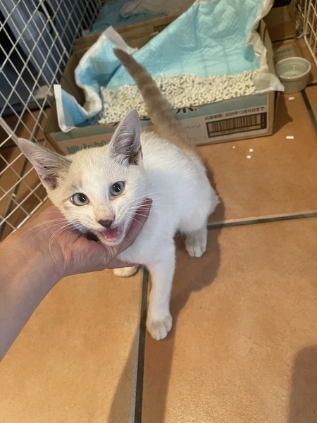 | 里親募集する理由 | 家の敷地内で24時間以上、1匹でないていて、母親猫がくるかと様子をみていました。 車を動かすときに、ボンネットをたたいてチェックしたら、ニャーと声がして、エンジンルームの中にいました。JAFの方にだしてもらうと、痩せて元気がない感じでした。 しばらくほっておいてみましたが、雨の中草むらでびしょ濡れでないているため、このままでは危ないなと保護しました。 我が家には2匹の犬がいて、私もネコアレルギーがあるため、里親を募集しております。 ワクチンは、保護してまもないため未接種ですが、9月27日接種する予定です。 |