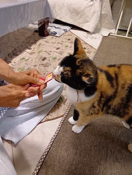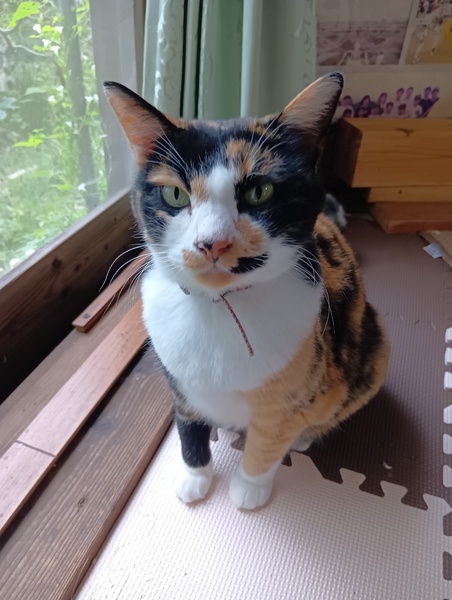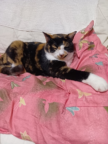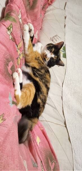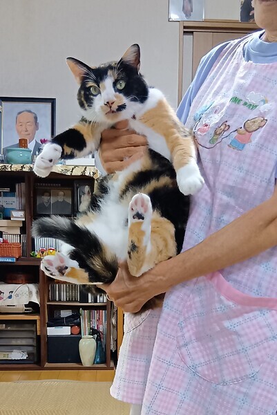 | 特徴(性格など) | 黒が多めの三毛猫。穏やかな性格です ウィルス検査でもワクチン接種でも嫌がらず、動物病院の先生から絶賛されました。お尻トントンが好きです |