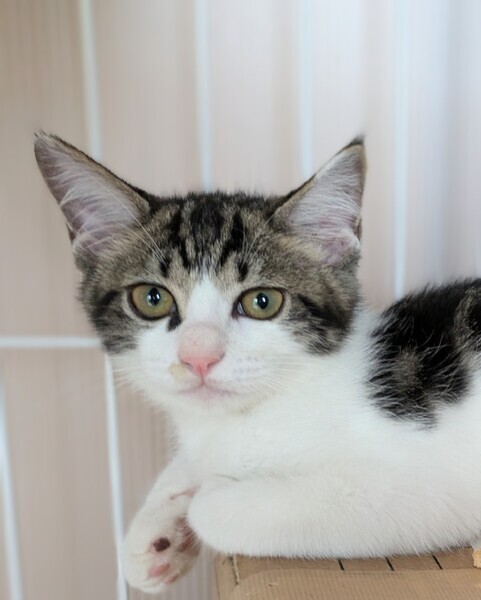 | 特徴(性格など) | きじ白男子「でこ」&灰白女子「こい」 2匹兄妹 「でこ」は元気、活発な男子 妹猫の「こい」とも仲良く遊んでいます 可愛らしい顔、瞳ぱっちり しっぽは長くてまっすぐ 美形兄妹です 3種混合ワクチン2回接種済み レボリューション、駆虫薬投与済み マイクロチップ登録済み ウイルス検査済み |