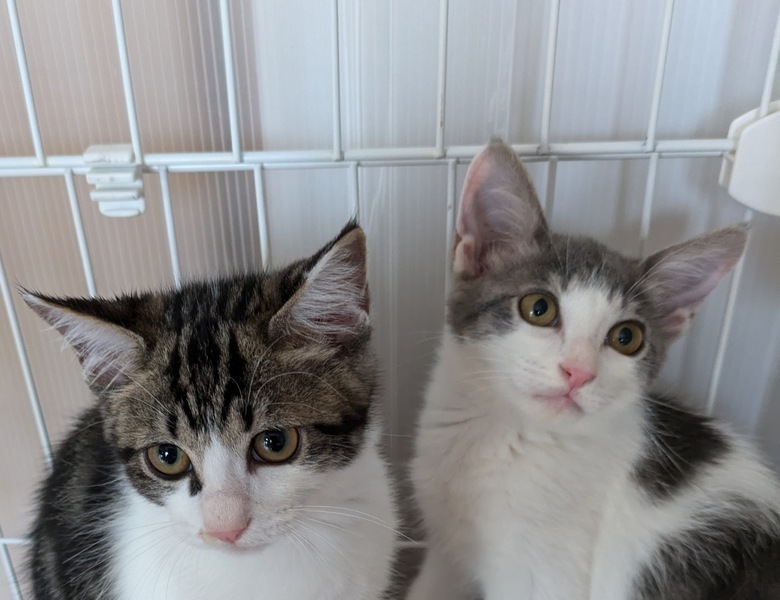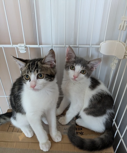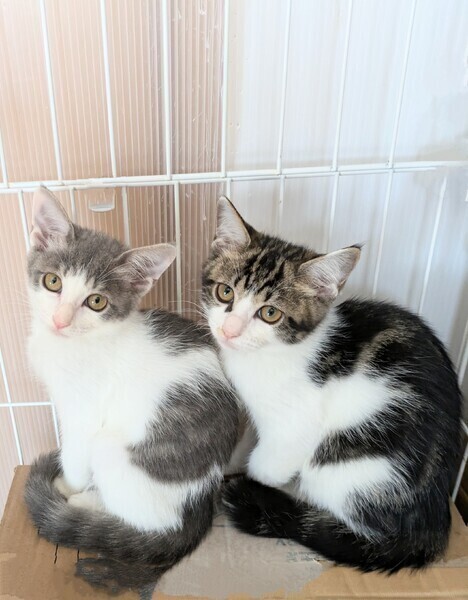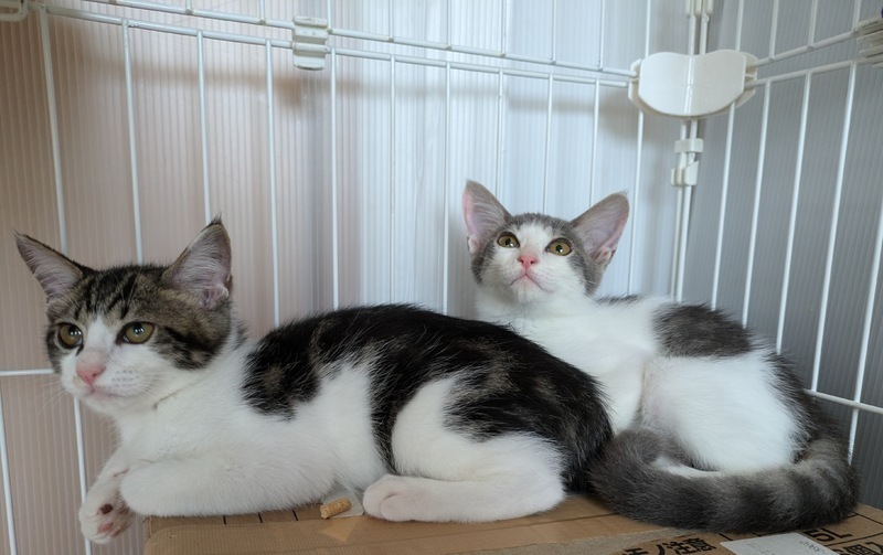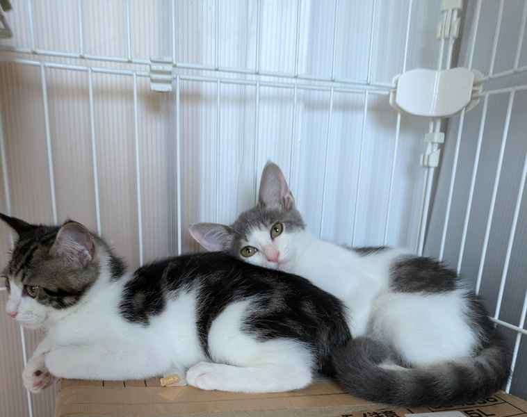 | 特徴(性格など) | きじ白男子「でこ」&灰白女子「こい」 2匹兄妹 「こい」はおっとりおだやかな気質の女子 兄猫の「でこ」とも仲良く遊んでいます 愛らしい顔つき、可憐な姿 しっぽは長くてまっすぐ 美形兄妹です 3種混合ワクチン2回接種済み レボリューション、駆虫薬投与済み マイクロチップ登録済み ウイルス検査済み 健康、元気です 兄猫の分のお皿のフードまで横取りして食べるほど食欲旺盛 |