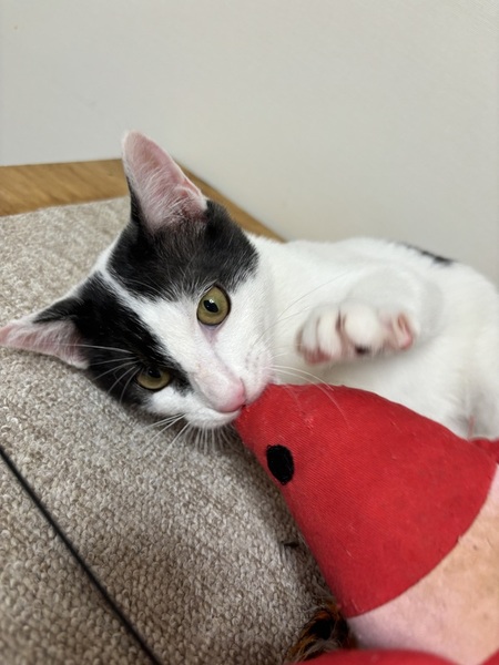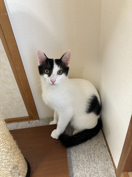| 特徴(性格など) | 白黒 鼻が綺麗なピンクで体にはリボン柄の模様があります。甘えん坊ですが初めての人にはビクビクします。慣れれば抱っこも出来ますし、膝に乗ってくることもあります。 | ||