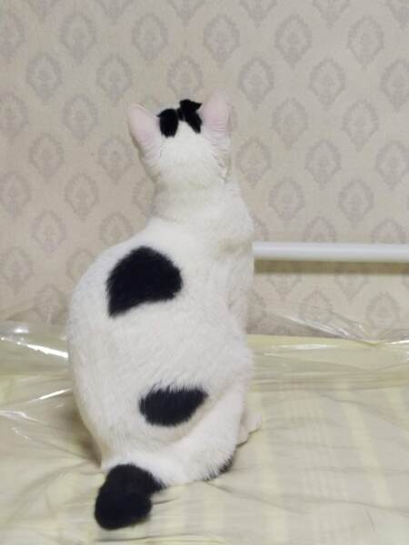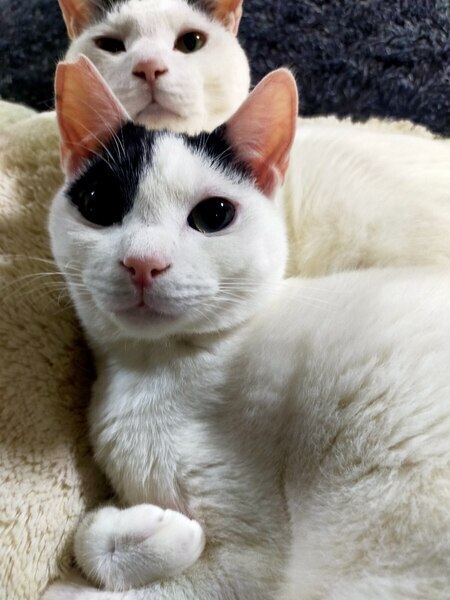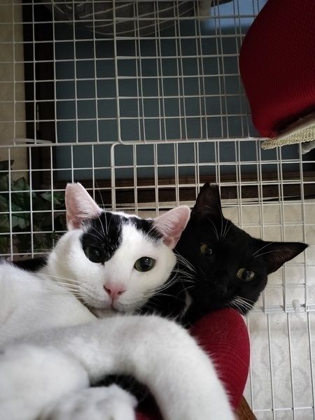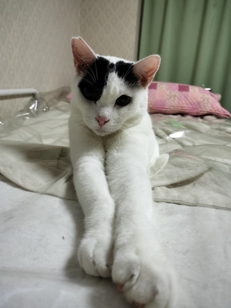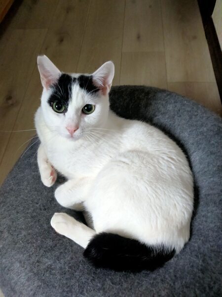 | 特徴(性格など) | 白黒ねこです。ダークグリーンの目が特徴 黒くて短いしっぽ、頭のてっぺんにリボンのマークあり。のろりとした動きですが、動きのあるおもちゃには飛びついてきます。朝の日課の猫用YouTubeが大好きです。 よく食べます。食べたらすぐに横になるので、最近お腹周りが大きくなってきました。 |