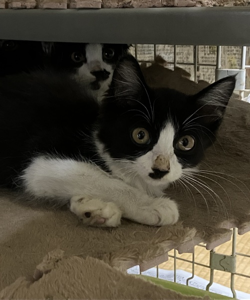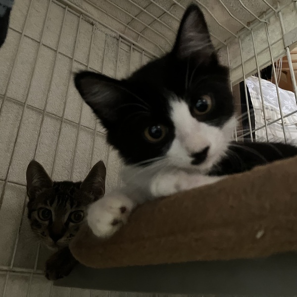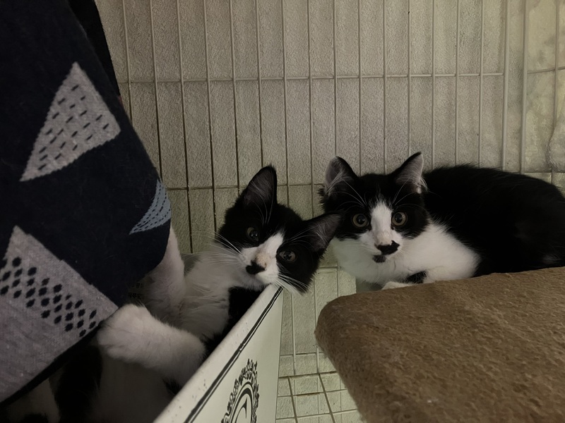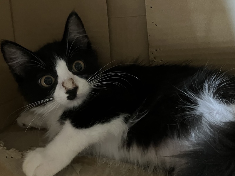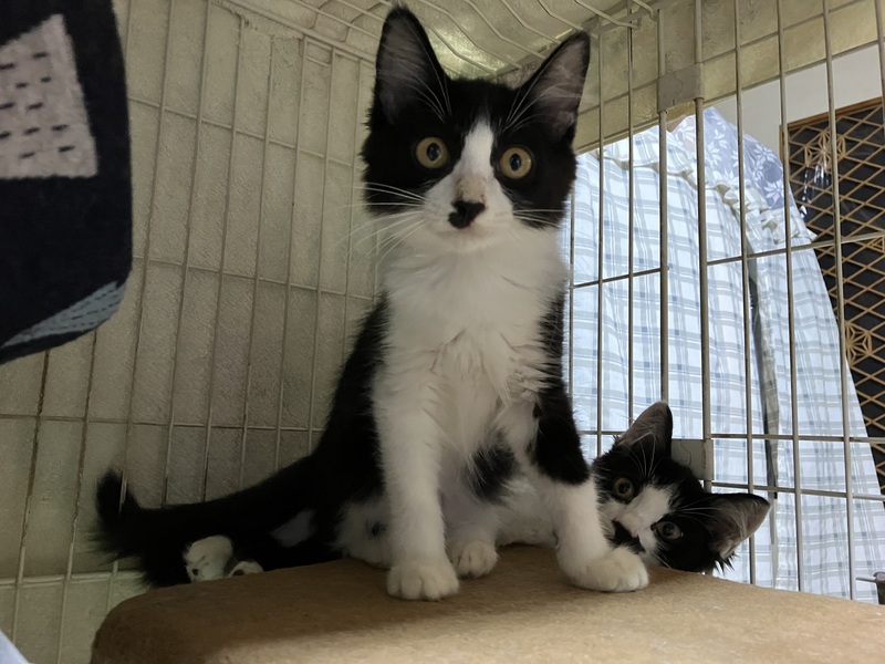 | 特徴(性格など) | よく食べよく寝てよく遊び、子猫らしくてかわいい女の子です。 こちらを見て声をあまり出さずに鳴く様子も、なんともチャーミングです。 真ん中から分かれたきれいなハチワレに、真っ直ぐな長い尻尾、母猫譲りで毛がちょっぴり長めです。 撫でられるとゴロゴロと喉を鳴らしてお腹を見せます♡ ねこじゃらしには、兄弟の中でも1番乗ってきます! |