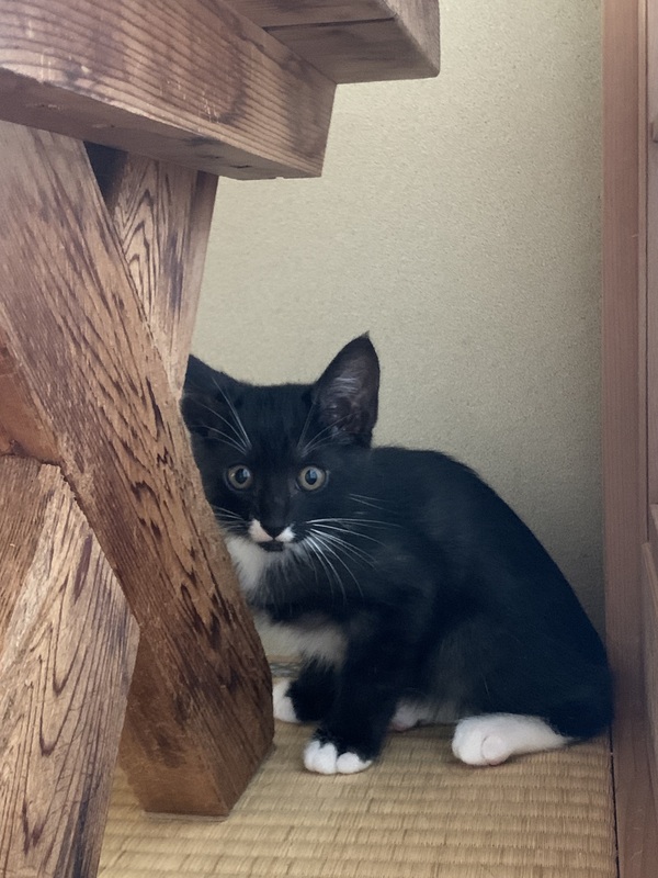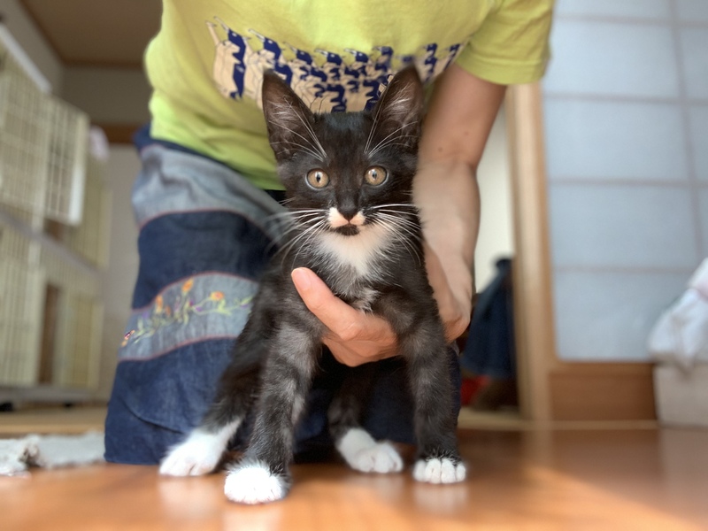 | 特徴(性格など) | 黒くて、手足とお鼻と胸が白い黒白ちゃん。 野良のお母さんから産まれました。 兄弟3匹のうち1番活発です。好奇心も1番。食欲も1番。人馴れも1番早いです。 毎日よく食べよく遊びよく眠っています。 ウイルス検査陰性です。 |