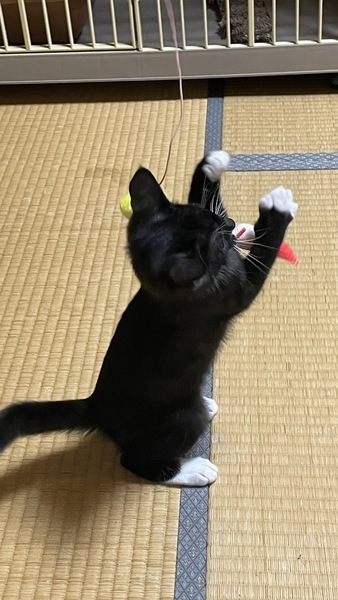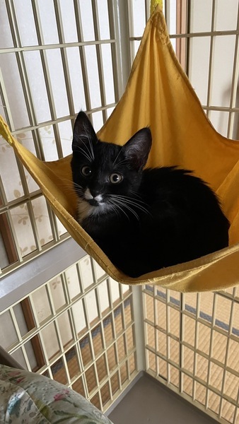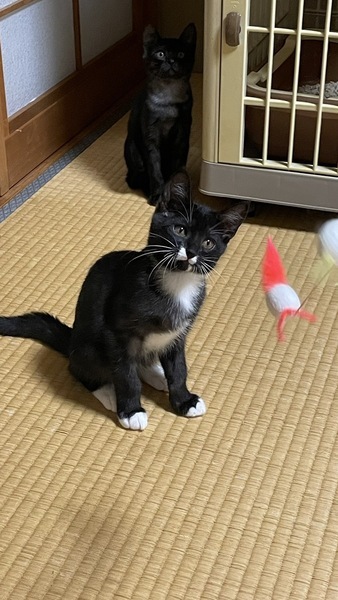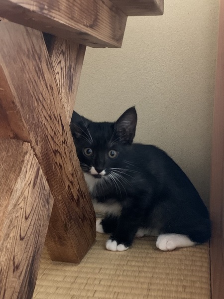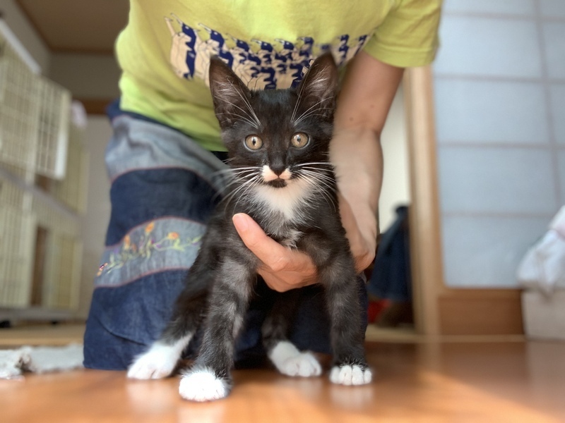 | 特徴(性格など) | 黒くて、白い靴下履いてるみたいな黒白ちゃん。野良のお母さんから産まれました。 兄弟3匹のうち1番活発です。好奇心も1番。食欲も1番。人馴れも1番早いです。 人が好きで、身体をこすりつけて甘えてきます。 ウイルス検査陰性です。 |