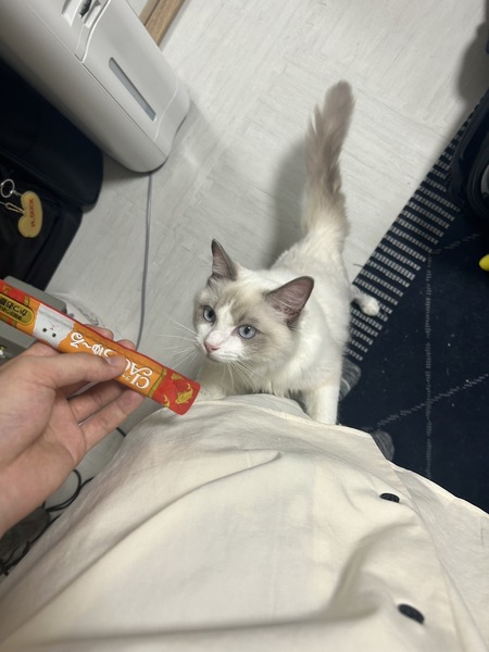 | 特徴(性格など) | 生後8ヶ月(まだ0歳)のラグちゃんです!お目目の色が綺麗な水色で、毛並みも他の猫よりふわふわで柔らかいです。普段は大人しいのですが、元気な時は部屋中を走り回っています(*´꒳`*) また、ものすごく甘えん坊で、ご主人が家に帰ると必ずお出迎えしてくれますし、ゴロゴロ言ってすりすりしてきます。 声も高く、本当に可愛らしいです! 9月に大きな骨折をしてしまい、手術することに、無事成功したものの、少し後遺症が残ってしまいました。(着地時に左後ろ足が少しだけ曲がっている。)ただ、生活には全く影響しておらず、本人も治ってから走り回っているほど元気です( * ˙ᵕ˙ * ) |