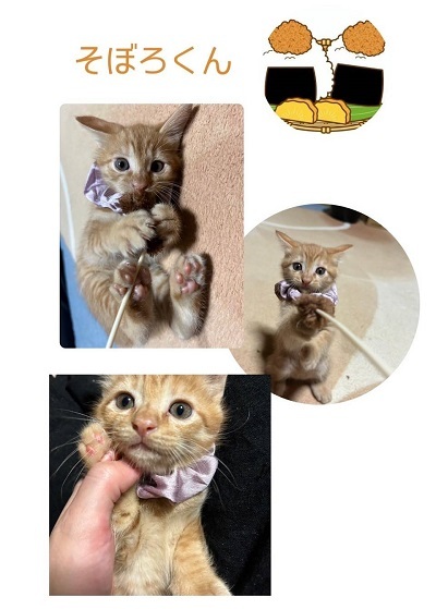 | 特徴(性格など) | ノミ取り薬済(10/5) とってもマイペースな末っ子タイプ 兄弟猫と一緒に遊んでても急に寝だしたりします おもちゃが大好きな子です ※まだ小さいので出来る限り近場で 兄弟で貰ってくれる方優先で考えています 独り暮らしの方、ご高齢の方はご遠慮ください |