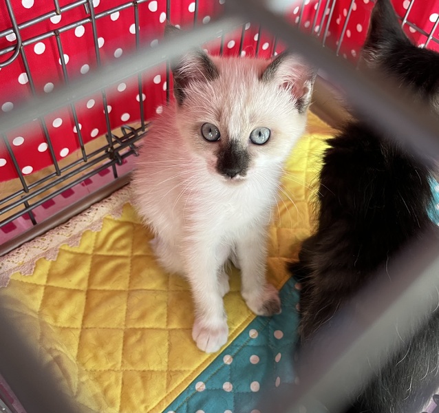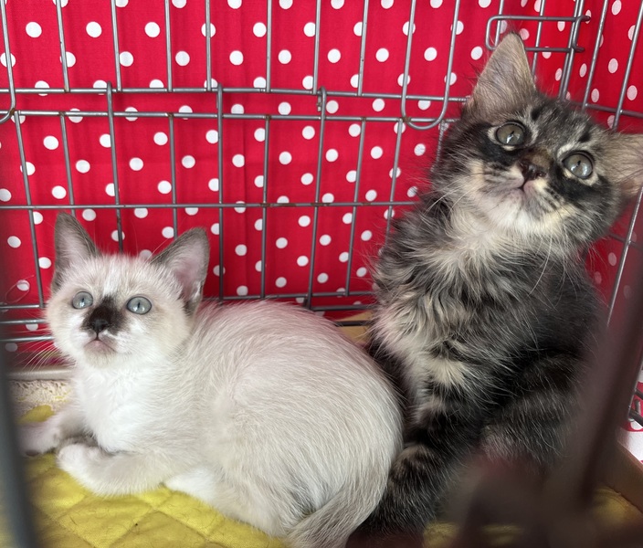 | 特徴(性格など) | シャム系♀ 長毛キジトラ♂ 仲良しの兄妹です。 オスのキジトラはお兄さん的存在 メスのシャムは女の子らしい性格です。 |