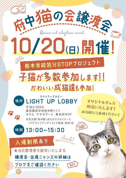 | その他(譲渡条件など) | ୨୧⌒⌒⌒⌒⌒⌒⌒⌒⌒⌒⌒⌒⌒⌒⌒୨୧ 府中駅直結⭐︎譲渡会のお知らせ ୨୧⌒⌒⌒⌒⌒⌒⌒⌒⌒⌒⌒⌒⌒⌒⌒୨୧ 【日時】10月20日(日)13時〜15時半まで 【場所】LIGHT UP LOBBY (下記のリンクに詳細あり) ※事前に整理券を配布。ご予約は必要ありません。 https://chuneko.exblog.jp/32603337/ ※会場への直接のお問い合わせはお控えください。 ご質問はfuchu_nekonokai@yahoo.co.jpまで こんにちは。『NPO法人府中猫の会』です。 地元のTNR活動&保護活動(野良猫を増やさない取り組みや行き場のない猫達の保護)に尽力しているボランティア団体です。 その他にも、当ボランティアの取り組み『熊本市殺処分STOPプロジェクト』として、180匹の保護猫達を熊本から東京に空輸して参りました。 今回ご披露する猫ちゃん達は、くまっ子空輸にゃんずの他、飼い主から飼育放棄されてしまった捨て猫や強制執行で夜逃げされた猫達など、どの子達もみんな行き場のない子達ばかりを保護し、育て上げた子達が参加します。 今回出場する子達は全匹お留守番OKなのでお仕事をフルタイムでお持ちのご家庭でも問題なく迎えていただけます。 自信を持って、この度もかわいい子ども達をご紹介させていただきます! 活動内容や保護猫達の様子が気になる方は、ぜひ!YouTubeちゅー猫チャンネルをご視聴ください。 ↓↓↓ ฅ^•ﻌ•^ฅ♡ちゅー猫チャンネル https://youtube.com/@chuneko ◆子猫も多数参加予定の譲渡会。 ◆血液検査、ワクチン2回接種、マイクロチップ装着、全ての医療を終えております。ご安心ください。 【 よくあるご質問 】 ◆猫を飼いたい。でも保護猫ってハードルが高い気がする… その点はご安心ください。出場する全ての猫達はみんな家猫訓練を受けており、トイレ訓練もパーフェクトな猫達です。 猫飼い初心者OKな猫ちゃんも多数出場します。 ◆60歳を超えているが、猫を迎えたい。 今時の60代様、70代様は、大変お若くアグレッシブでいらっしゃいます! そんな方々にはぜひ!成猫さんをオススメさせていただきます。 今回出場する成猫さんは、捨てられた子達ばかりです。(多頭崩壊、飼育放棄、夜逃げによる強制執行) みんな心に傷を負っている子達を保護しております。しばらく心のケアや家猫訓練をバスした子達を出場させますので、ぜひ!会いに来てください。 ※60歳以上の方は後継人をお願いしております。後継人の方とご来場いただくと私達も選考しやすいのでよろしくお願いします。 ◆わが子の為にも保護猫を迎えたい!しかし、私達家族一同、猫を飼うのは初めてです。どうしたらいいですか? そのようなご家庭こそぜひ!お待ちしております! 猫ちゃんの魅力を知っていただきたいのと、お子様が保護猫達と一緒に育つ事により『命に優しい情操教育』となると願っている当会です。 喜んでお待ちしております。 ※猫アレルギー問題があります。初めて猫を飼う方は猫アレルギー検査を事前にしていただくと私達も選考しやすいです。 特にお子様には必ず検査をお願いします。 ◆仕事があって、お留守番をさせるのが心配… ご心配はご無用です! 今回出場する子達はみんな成猫さんなので、一日フルタイムでお仕事をお持ちのご家庭でも問題なく迎えていただける子達ばかりです。 【 譲渡会にご参加くださる方々へ 】 ₍ᐞ•༝•ᐞ₎◞ ̑̑ ◎混雑を防ぐ為、入場制限をさせていただきますが、ご予約の必要はございません。 入り口カウンターにてスタッフが整理券を配布いたしますのでご協力お願い申し上げます。 ₍ᐞ•༝•ᐞ₎◞ ̑̑ ◎初めて猫ちゃんを迎える方(特にお子様のいるご家庭)は、猫アレルギーの有無を明確にしてくださると選考しやすいです。 ₍ᐞ•༝•ᐞ₎◞ ̑̑ ◎譲渡会はお見合いのみの場となっております。 ご来場前に必ず下記の事項をご参照ください。 ▶︎譲渡会のシステムについて◀︎ https://chuneko.exblog.jp/32604872/ 【見学希望やご支援者の方々へ】 ₍ᐞ•༝•ᐞ₎◞ ̑̑ いつもありがとうございます♡ 会場はホテルのカフェとなっております。 お飲み物をご注文くださればお席にご案内いたします。(入口スタッフに一言お申し出ください。) 大変申し訳ないのですが、里親希望の方々を優先的にご案内させていただくのをご了承の上、お越し下されば幸いです。 会場では、ちゅー猫オリジナルグッズも販売しております。 |