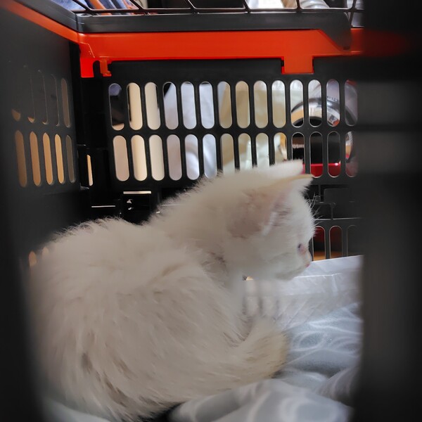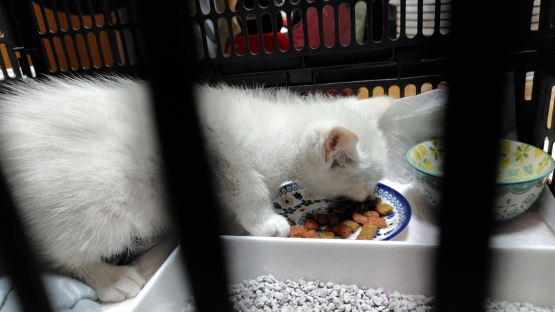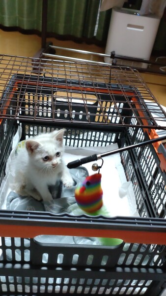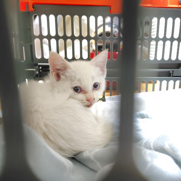 | 特徴(性格など) | 真っ白で毛は長めです。尻尾だけ少しクリーム色がかっています。 保護する際は元気がなかったのか逃げることなく、ネットに入れることができました。 しかし、保護してからも人を怖がる様子はなく、ご飯をあげるときには人の手にくっついてきます。 ウエットティッシュで顔も拭かせてくれました。人が近づくと「にゃ~にゃ~」言ったり「ごろごろ」喉を鳴らしたりします。 人懐っこい子のようです。 |
