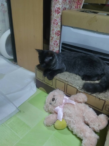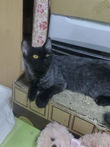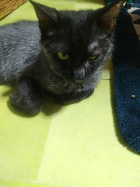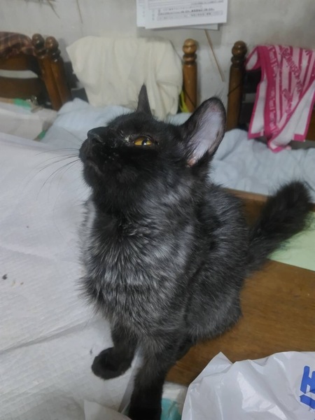 | 特徴(性格など) | 黒猫ちゃんだったのですが成長につれてグレーが混ざって来ました。 お腹辺りと尻尾がグレーぽいです。 お腹辺りは中毛で尻尾は長毛です。 人が大好きな子で人の後を着いていく様な子です。お布団にも潜っていくそうです。 おおよその生まれた日付で大体生後5ヶ月ぐらいだと思います。 |