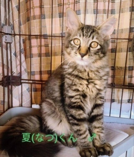 | 特徴(性格など) | キジトラです。 無邪気で、じゃらしで構ってもらうの大好き、触られるのはちょっとまだビックリします。ふわふわの尻尾が特徴です。 エイズ・白血病(-) 駆虫済み |