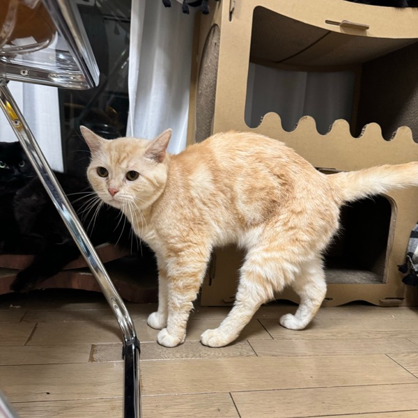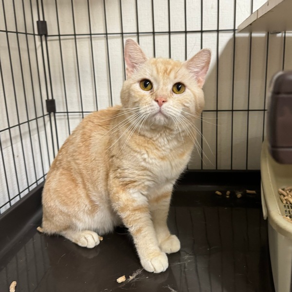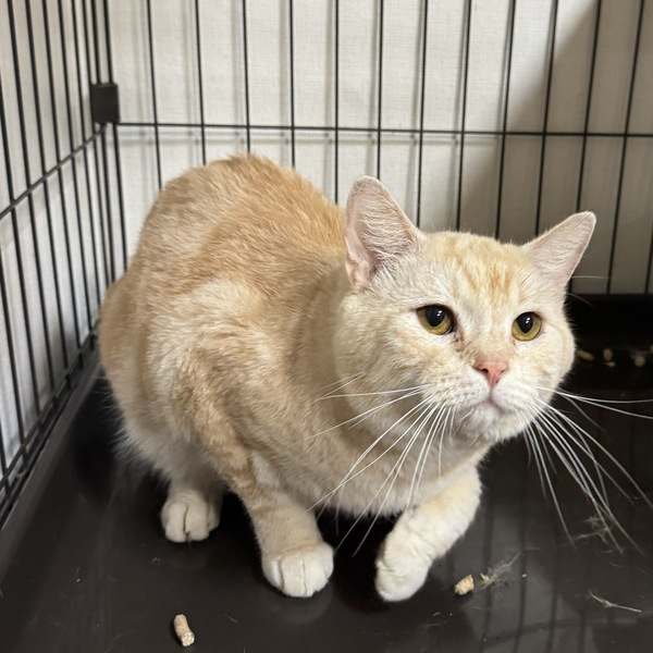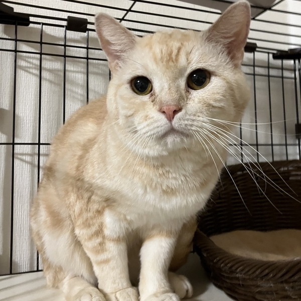 | 特徴(性格など) | 優しいクリームカラーに困ったお顔がたまらなく愛おしい、マンチカンのげんちゃんです。 ピンクのお腹にアメショとお揃いのお腹のぐるぐる模様がチャームポイント。 元々は人間の手や存在は怖がらないのに明確に人間が嫌いで信用していない子でした。 人間が側にいる環境ではあったけど、優しくしてもらった経験がないのだろうな、という印象でした。 常にシャーシャーなのに、その反面爪も出さず噛みもせず色々と諦めていたげんちゃん。 ゆっくり、ゆっくり時間をかけて仲良くなろうね、と距離を縮めていくと、いつしか少しずつ人間を信用してくれるようになりました。 なでなでも今では気持ちよさそうに体を預けてくれる時がありますよ。 おもちゃも当初は怖がっていましたが、今では食いつきよく遊んでくれてすごくかわいいです。 来た時はセルフネグレクトなのかグルーミングをせず体の毛がつねにボサボサでひどい状態でしたが、今ではグルーミングもするしブラッシングもさせてくれて、本当に綺麗な美猫になりましたよ。 新しい環境に行ったら、もっともっと成長していくのではないかと思っています。 また人間を信じてくれた、本当に頑張り屋さんでかわいいげんちゃんに素敵なお家を探しています! 大人しくマイペースなげんちゃんなので、小学生以下の小さなお子様がいるご家庭は難しいかと思います。 犬との同居は犬さん側が大丈夫な子でしたらげんちゃんは問題ないです。 興味なし、といった感じでストレスにもならないようです。 猫との同居はウェルカムで、本猫はとっても猫が好きです! 鼻チョンのご挨拶も上手にし、体を擦り付けようとします。 攻撃性もなく、遊びがしつこいような様子もないです。 |