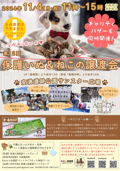 | その他(譲渡条件など) | ぷーま君は11月4日の安満遺跡公園での譲渡会に参加します。個別お見合いもできますので、日程が合わない方はご相談ください。 里親決定は先着順ではありません。お申込みいただいてもお断りする場合があります。 |