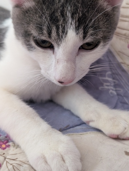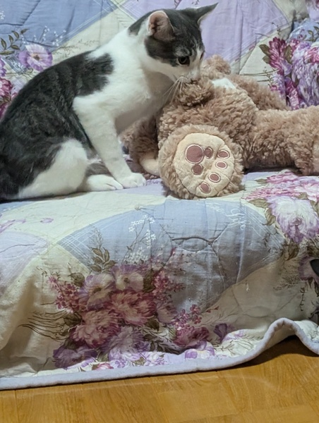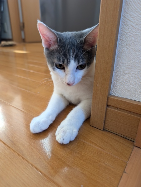 | 特徴(性格など) | 最初だけ少し警戒しますが兄妹の中で一番に慣れてくれた甘えっこさんです。 寝てると必ず横にいてごろごろと言っています。 だっこするとこちらに体重を預けてきてくれるのがかわいいです。 爪とぎで爪研ぎますし、トイレ失敗なし。猫ともフレンドリー 小さいとき母や兄妹で育っており社会性が身につおいております。 今後の長い猫性 こちらかなり重要なポイント です。 |