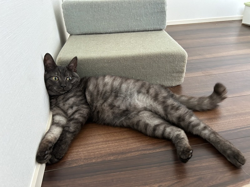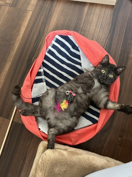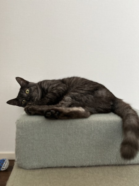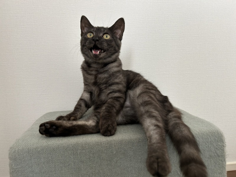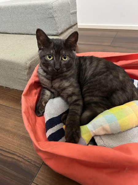 | 特徴(性格など) | 動物病院で、推定1歳未満との事。ブラックスモークという珍しい柄のメス子猫ちゃんです。とても元気いっぱいで、膝に乗って、ゴロゴロ、フミフミの甘えんぼさん。おしゃべりも得意で、「ご飯よー」「んにゃー」、「雨だねー」「にゃっ」、と色々お返事してくれます。だけど保護当初から、夜鳴きはありません。たくさん遊んで、幸せな猫生にしてあげてください。 | ||