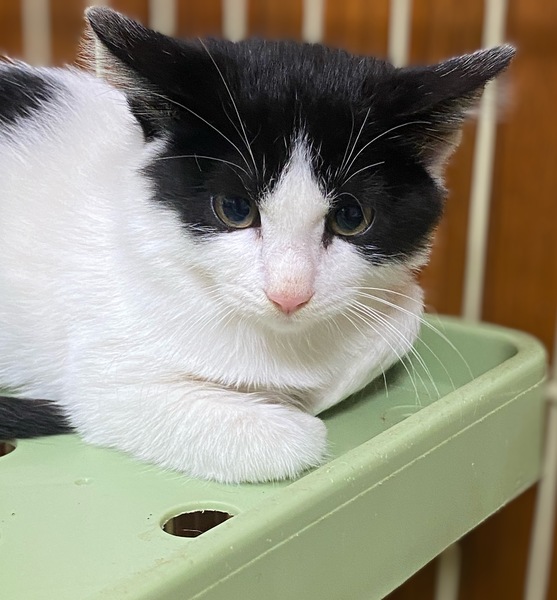 | 特徴(性格など) | 白黒の小さな男の子です。 エイズ、白血病検査は陰性。 少しずつ馴れてきました。 好奇心も出てきて、ケージの中から、キョロキョロするようになってきました。 |