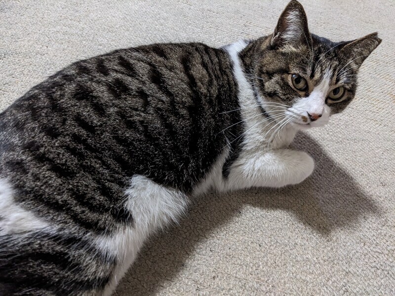| 里親募集する理由 | 2017年生まれの7歳のメスです。生まれた翌年に避妊手術されて地域猫になり、うちの近くで暮らしていました。2022年からうちに餌をねだりに来たので世話していましたが、この10月に怪我をしたのをきっかけに保護し、動物病院にて治療していただきました。入院は一ヶ月ほどかかりましたが怪我は回復し、元気を取り戻しています。病院の方にもよく懐くようになり、室内飼育にも慣れてきました。 今後は完全室内飼育が必要なため、里親を募集しています。 |