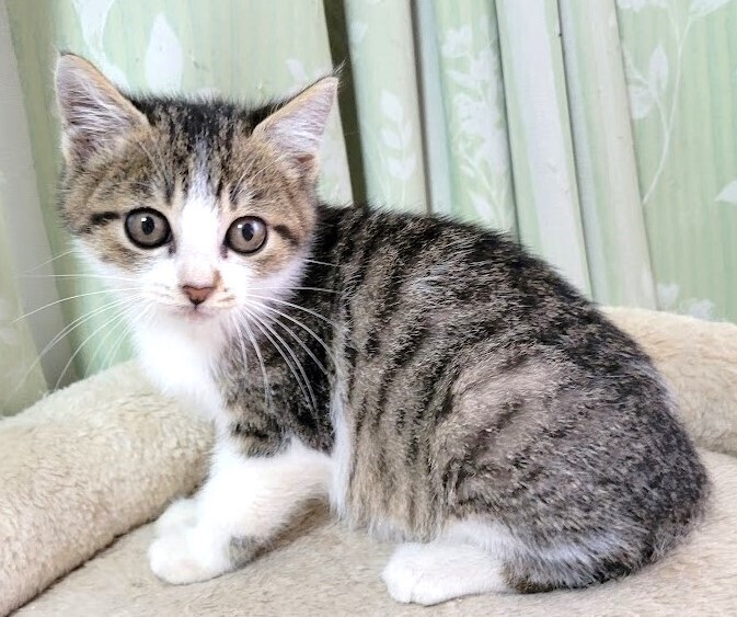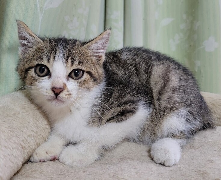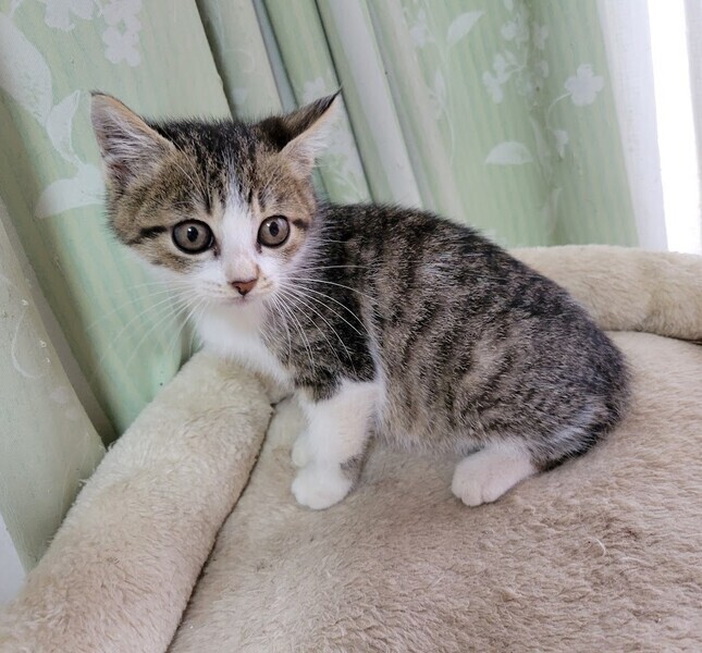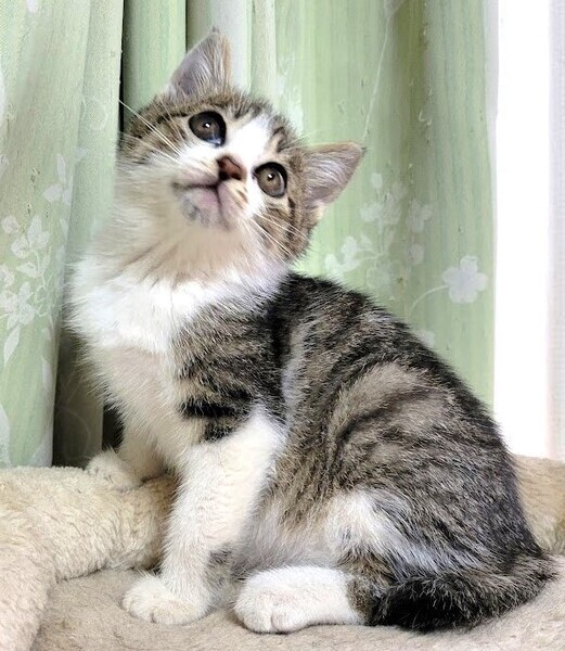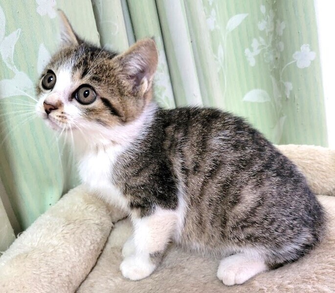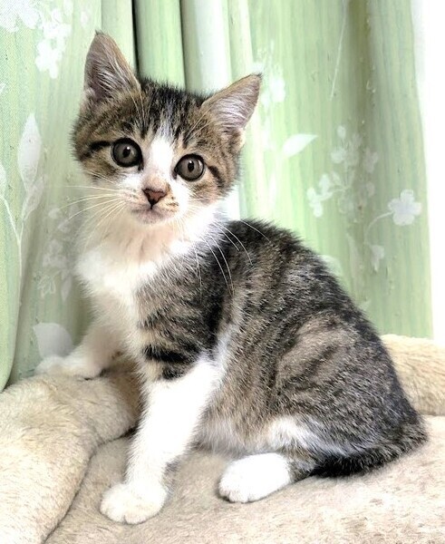 | 特徴(性格など) | 仮名: りんくん、オス 毛色: キジ白 性格: 人馴れしています。じゃらしなどのおもちゃで元気に遊んでいます。 初対面の人でも怖がる事なくフレンドリーです。 保護する前は大人猫と遊んでいたりもしているので、先住猫のいるお家でもすぐ慣れると思います。 まだ小さいので、留守番時間の短い環境を希望します。 |