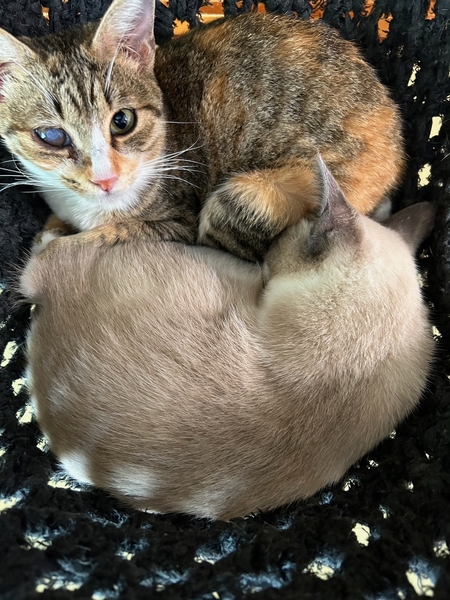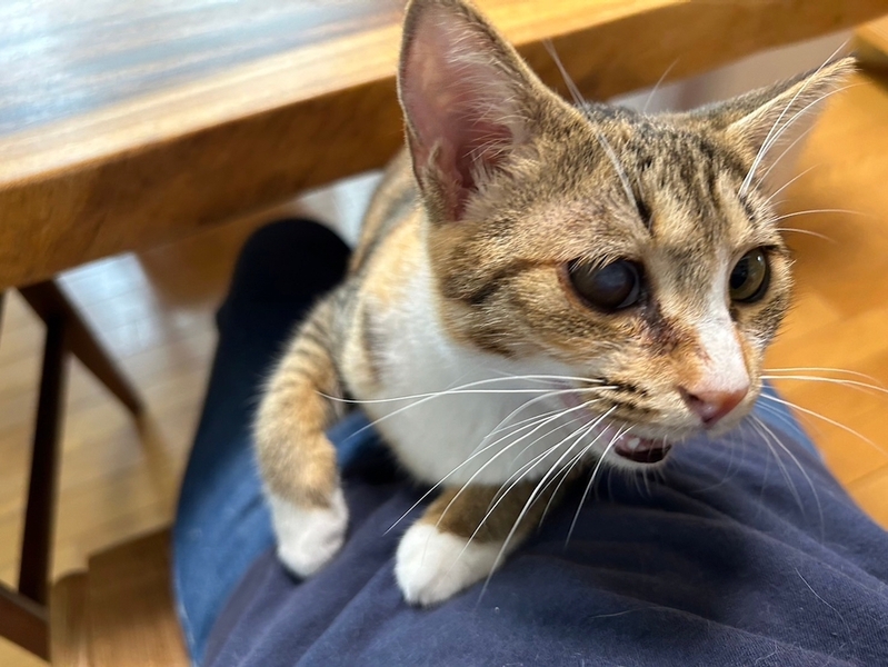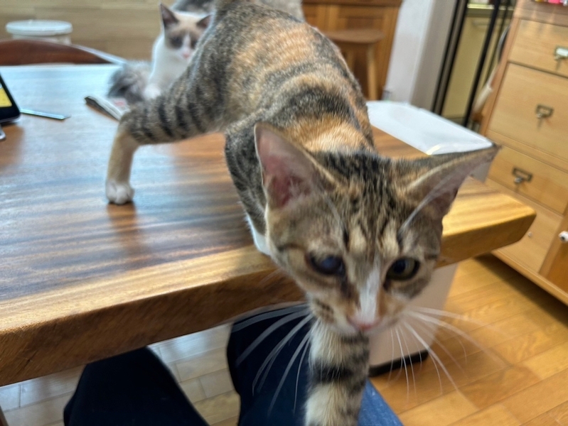 | 特徴(性格など) | とてもよく慣れています。 抱っこ大好き。 猫風邪の後遺症で片目の視力がほとんどありません。 日常生活においては普通になんでもできます。(むしろお利口三毛なのでだいぶ賢いです) ロイヤルカナンのドライを食べています。 引き続き同じか同等のフードでの飼育をお願いします。 シャム・ミケ・キジの3姉妹でやってきてキジの子は別グループの同じ月齢の猫とトライアルに行きました。シャムたんとミケたんも姉妹でのお迎えが可能な方を優先いたします。(個別の対応はいたしません) |