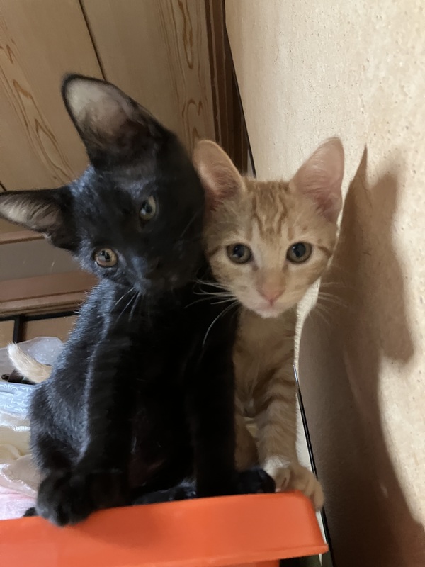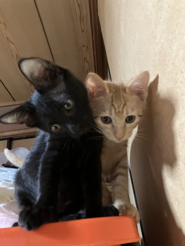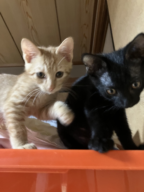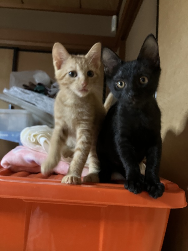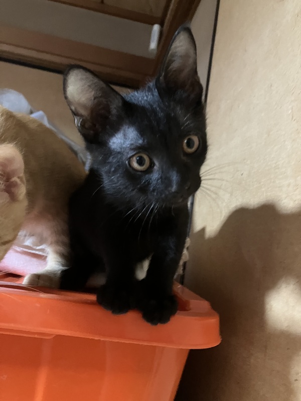 | 里親募集する理由 | 友人の家の庭先に姿を見せるようになり、とても痩せていて、必死で庭先にたどり着き、隠れながらご飯か親猫を探しているようでした。その後も親猫は周りに現れず、誰かが捨てていったのかもしれません。とても小さくか細い声で鳴いているところを見かねて保護することになりました。もう1匹黒猫の兄弟も一緒にうろうろご飯を探して鳴いていたので一緒に保護しました。 友人は高齢で飼うことができないので、里親さんを探すことになりました。 |