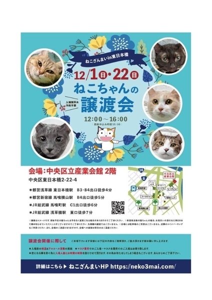| その他(譲渡条件など) | 11:30より、2階会場入口にて受付を開始します。 受付時に入場予定時間が記入された整理券をお配り致しますので、整理券を受け取った方はお時間になりましたら2階会場入口に番号順にお並び下さい。 ※11:30より早くいらしてもお待ちいただく場所がございません。 また、近隣にお住まいの方や他階フロアのご利用者様にご迷惑となる場合がございますので、受付開始時間にあわせてお越しくださいますよう、何卒ご協力お願いいたします。 ※ねこざんまい譲渡会は、先着順で里親様を決定する譲渡会ではありません。 先に申し込みをした方を優先することもありません。 お話をして、その猫ちゃんに合ったおうちに決めさせていただいております。 12時に開場し、里親様の決定は14時以降となります。 14時以降にご入場の場合、希望の猫ちゃんが決定している可能性があります。 また1頭に対し多数のご希望をいただいた場合、早めに申し込みを締め切らせていただく場合がございますので、予めご了承下さい。 里親様決定は14時以降となります。 その後、迎え入れ準備の説明等のお時間も頂戴しますので、お時間に余裕を持ってご来場下さい。 ~~~~~~~~~~~~~~~~~~~~~~~~~~~~~~ ★仔猫ご希望の里親様★ 仔猫ちゃんたちは、まだ体がしっかりしていない赤ちゃんです。 下痢だけでも数時間対応ができなかっただけ死に至る事もあります。 その為、月齢に応じたお留守番時間を設けさせていただいております。 また、子猫ちゃん(6ヶ月未満)の里親様には子猫支援金のご協力をお願い致しております。 ★猫ちゃんとのお見合いは譲渡会で!★ ねこざんまいの猫ちゃんは譲渡会でのお見合いのみとなります。 『この子はいつ譲渡会に参加するの?』『譲渡会場の場所はどこ?』などは、ねこざんまいホームページをご覧ください。 https://neko3mai.com/ ★楽しく猫ちゃんと触れ合って★ ねこざんまい譲渡会は、猫ちゃんも里親様も保護主も笑顔で過ごせる譲渡会を目指しています。 これから20年以上、楽しい時も、悲しい時もいつも傍にいてくれる大切な家族になる猫ちゃんです。 会場には沢山の猫ちゃんがいます。 1匹1匹、触れ合って猫ちゃんとお話してください。 『初めて猫ちゃんを家族に迎える方』 『先住猫ちゃんのお友達を迎える方』など トライアルの仕方や先住猫ちゃんと仲良くなるコツなど経験豊富な保護主やスタッフにお気軽にご相談ください! 猫を愛し、そして猫に愛されている猫好きスタッフと保護主がアドバイスさせていただきます。 ★里親希望のみなさまへ★ ペットではなく、家族一員としてたっぷり愛情を注いでくださるご家庭をお待ちしております。 恐れ入りますが ●学生の方 子猫・幼猫希望の60才以上の方のみのご家庭 ●脱走防止対策にご協力いただけない方 は原則譲渡を遠慮させていただいております。 ●一人暮らし・同棲(事実婚)の方 保護主の希望や猫の年齢・性格等により、ご希望に添えない場合もございます。 参加猫ちゃんは、それぞれ保護主(実際に猫ちゃんを自宅に入れ、保護をしている方)が異なります。 詳しい条件なども異なる場合がございますので、会場内で直接保護主とお話ください。 〖共通条件〗 1.終生飼育 2.完全室内飼い 3.脱走防止対策へのご協力 4.避妊去勢手術 5.契約書類へのサイン 6.定期報告 7.医療費等の負担 当日の猫ちゃんを連れて帰ることはできません。後日、保護主が里親様のご自宅までお届け致します。 その為、移動の際の猫ちゃんの負担を月齢などから考慮し、お届け地区を限定させて頂くこともございますのでご了承ください。 ご理解とご協力のほど宜しくお願い致します。 ☆よくある質問☆ ・譲渡の条件 ・ご負担頂く費用 ・譲渡会の場所等は ホームページに詳しく掲載させて頂いておりますのでご覧ください。 https://neko3mai.com/ メールでのお問い合わせはすぐにご返答出来ない場合がございますのでご了承ください。 ホームページ https://neko3mai.com/ お問い合わせ http://www.neko3mai.com/contact/form_general.html ねこざんまいブログ http://ameblo.jp/neko3mai/ |