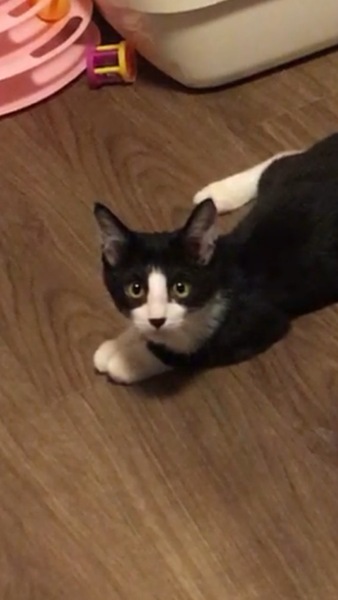 | 特徴(性格など) | 陽(ハル) 毛色:黒白ハチワレ 性格: 人馴れしています。穏やかで静かな子です。抱っこ、爪切りさせてくれます。オモチャで遊ぶのも好き! 左前脚のリハビリ中、現在はまだ少しびっこ気味ですが、キャットタワーにも登れます。歩行、走りに支障ありません。3段ケージハウス使用。 トイレしつけ済み。夜泣きなし。 体重: 1.8kg マイクロチップ装着: 装着済み 飼養環境制限: 完全室内飼育 単身応募者: 可 高齢応募者: 不可 初期医療処置 ※3種混合ワクチン10月31日2回目接種 ※ノミダニ予防、内外寄生虫予防済み ※ウィルス検査 陰性 注意事項・その他:ヤンチャな月齢ですが、割と大人しい方です。大切に育ててくださる方とのご縁がありますように? |