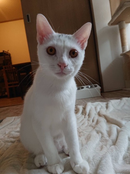 | 特徴(性格など) | 頭にグレーの柄ありますが、身体は白色です。尾尻はストレート。人大好き好奇心旺盛、お喋りも大好きです。気が向くと、ワンちゃんみたいに、投げた物持ってきます。 健康で、ご飯よく食べて、おトイレマナーも大丈夫です。 兄弟のまめちゃんと仲良し、一緒にお迎えくださる方希望です。 トライアル期間あります。 |