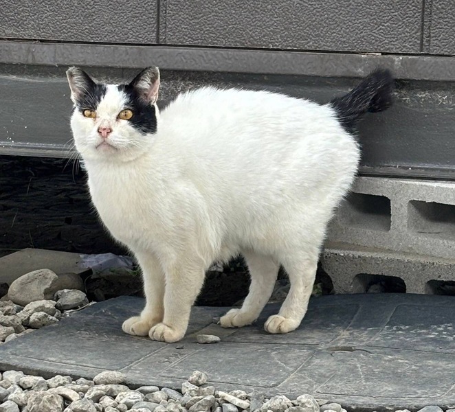 | 特徴(性格など) | 名前はぼっちゃんです。 頭と尾尻(中長)が黒色、後は全身白色です。 兎に角、人馴れ馴れのおっとり性格子です。 お耳カットありで、猫エイズキャリアです。 ご理解くださる方よろしくお願い致します。 食欲旺盛、元気です。 河川敷での写真記載しました。 |