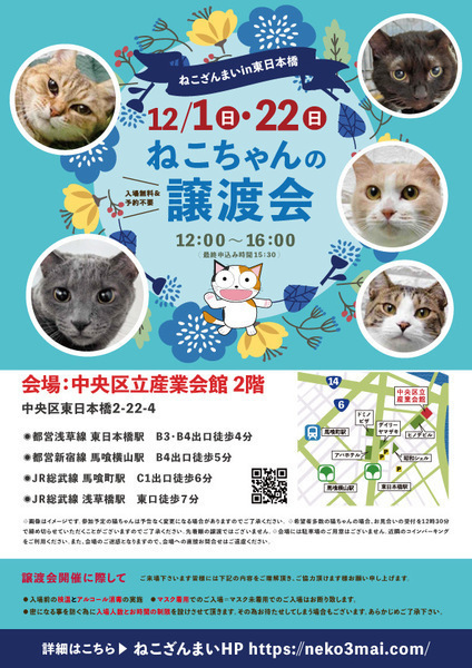 | その他(譲渡条件など) | 11:30より、2階会場入口にて受付を開始します。 受付時に入場予定時間が記入された整理券をお配り致しますので、整理券を受け取った方はお時間になりましたら2階会場入口に番号順にお並び下さい。 ※11:30より早くいらしてもお待ちいただく場所がございません。 また、近隣にお住まいの方や他階フロアのご利用者様にご迷惑となる場合がございますので、受付開始時間にあわせてお越しくださいますよう、何卒ご協力お願いいたします。 ※ねこざんまい譲渡会は、先着順で里親様を決定する譲渡会ではありません。 先に申し込みをした方を優先することもありません。 お話をして、その猫ちゃんに合ったおうちに決めさせていただいております。 12時に開場し、里親様の決定は14時以降となります。 14時以降にご入場の場合、希望の猫ちゃんが決定している可能性があります。 また1頭に対し多数のご希望をいただいた場合、早めに申し込みを締め切らせていただく場合がございますので、予めご了承下さい。 里親様決定は14時以降となります。 その後、迎え入れ準備の説明等のお時間も頂戴しますので、お時間に余裕を持ってご来場下さい。 【新型コロナウィルス感染予防対策について】 譲渡会開催に際し、ご来場下さいます皆様には以下の内容をご理解頂き、ご協力頂けます様お願い申し上げます。 ●入場前の検温とアルコール消毒の実施 ●マスク着用でのご入場=マスク未着用でのご入場はお断り致します ●入場人数の制限をさせていただきます(来場多数の場合は入れ替え制となります) ●時間と人数の制限=密になる事を防ぐ為に入場人数とお時間の制限を設けさせて頂きます その為お待たせしてしまう場合もございます ●会場利用規約により、ご来場者様の連絡先を控えさせていただきます あらかじめご了承下さい。 諸々の制限がございますが、安心・安全な譲渡会運営のためにご理解・ご協力いただきますようお願い申し上げます。 ~~~~~~~~~~~~~~~~~~~~~~~~~~~~~~ ★仔猫ご希望の里親様★ 仔猫ちゃんたちは、まだ体がしっかりしていない赤ちゃんです。 下痢だけでも数時間対応ができなかっただけ死に至る事もあります。 その為、月齢に応じたお留守番時間を設けさせていただいております。 また、子猫ちゃん(6ヶ月未満)の里親様には子猫支援金のご協力をお願い致しております。 ★猫ちゃんとのお見合いは譲渡会で!★ ねこざんまいの猫ちゃんは譲渡会でのお見合いのみとなります。 『この子はいつ譲渡会に参加するの?』『譲渡会場の場所はどこ?』などは、ねこざんまいホームページをご覧ください。 https://neko3mai.com/ ★楽しく猫ちゃんと触れ合って★ ねこざんまい譲渡会は、猫ちゃんも里親様も保護主も笑顔で過ごせる譲渡会を目指しています。 これから20年以上、楽しい時も、悲しい時もいつも傍にいてくれる大切な家族になる猫ちゃんです。 会場には沢山の猫ちゃんがいます。 1匹1匹、触れ合って猫ちゃんとお話してください。 『初めて猫ちゃんを家族に迎える方』 『先住猫ちゃんのお友達を迎える方』など トライアルの仕方や先住猫ちゃんと仲良くなるコツなど経験豊富な保護主やスタッフにお気軽にご相談ください! 猫を愛し、そして猫に愛されている猫好きスタッフと保護主がアドバイスさせていただきます。 ★里親希望のみなさまへ★ ペットではなく、家族一員としてたっぷり愛情を注いでくださるご家庭をお待ちしております。 恐れ入りますが ●学生の方、子猫・幼猫希望の60才以上の方のみのご家庭 ●脱走防止対策にご協力いただけない方 は原則譲渡を遠慮させていただいております。 ●一人暮らし・同棲(事実婚)の方 保護主の希望や猫の年齢・性格等により、ご希望に添えない場合もございます。 参加猫ちゃんは、それぞれ保護主(実際に猫ちゃんを自宅に入れ、保護をしている方)が異なります。 詳しい条件なども異なる場合がございますので、会場内で直接保護主とお話ください。 〖共通条件〗 1.終生飼育 2.完全室内飼い 3.脱走防止対策へのご協力 4.避妊去勢手術 5.契約書類へのサイン 6.定期報告 7.医療費等の負担 当日の猫ちゃんを連れて帰ることはできません。後日、保護主が里親様のご自宅までお届け致します。 その為、移動の際の猫ちゃんの負担を月齢などから考慮し、お届け地区を限定させて頂くこともございますのでご了承ください。 ご理解とご協力のほど宜しくお願い致します。 ☆よくある質問☆ ・譲渡の条件 ・ご負担頂く費用 ・譲渡会の場所等は ホームページに詳しく掲載させて頂いておりますのでご覧ください。 https://neko3mai.com/ メールでのお問い合わせはすぐにご返答出来ない場合がございますのでご了承ください。 ホームページ https://neko3mai.com/ お問い合わせ http://www.neko3mai.com/contact/form_general.html ねこざんまいブログ http://ameblo.jp/neko3mai/ |
