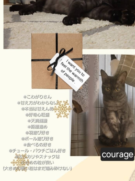 | 里親募集する理由 | このコがいた場所は街の中 車がたくさん行き交う大きな道路があり、捨てタバコも多く人がたくさんいる街の中でした ひとりで生活するには危険と感じ、保護しました。 |