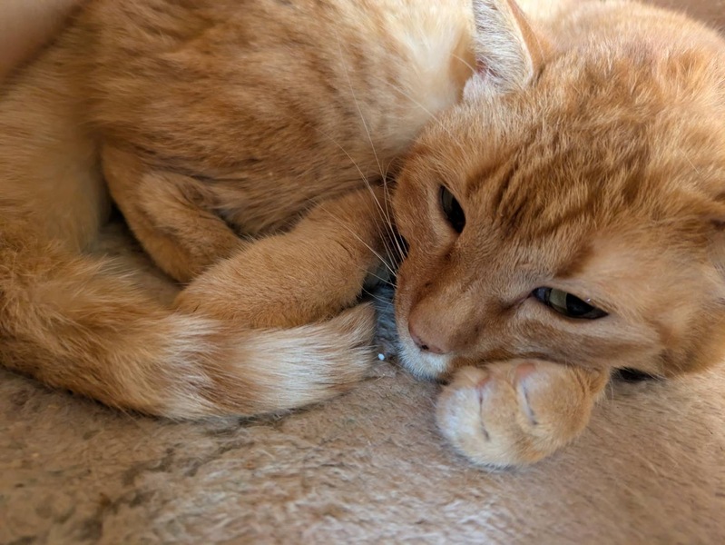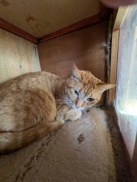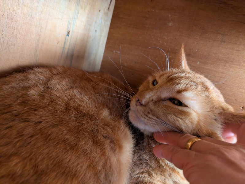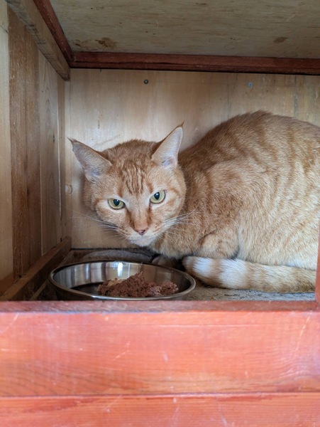 | 特徴(性格など) | 茶トラの女の子です。飼い主さんが亡くなってしまい、ボランティアさんで協力してお世話に通っていますが、少しずつ信頼関係が出来て来てなでなで大好きな子になって来ました。最初は臆病ですが慣れると甘えん坊の女の子になると思います。 | ||