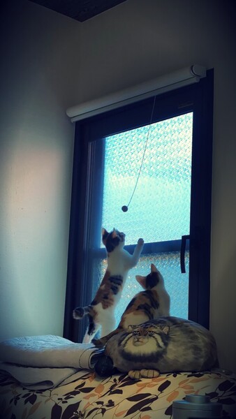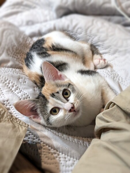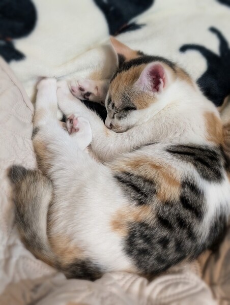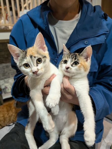 | 特徴(性格など) | ■仮名:はふ ■推定誕生日:2024年8月末頃 ■性別:女子 ■猫種:日本猫MIX ■毛色:いかにも三毛猫な感じの三毛 ■瞳の色:ヘーゼル ■尻尾:やや短めのかぎしっぽ ■体格:小さめ 姉妹のまみちゃんとの仲は良く、いつもコネコネコネコネ遊び、社会化期を健全に過ごしております。 小柄ですが足腰が強く、猛スピードで走り回り、高低差も攻略しております。 おもちゃに敏感に反応し、2時間くらいはぶっ続けで遊ぶ体力の持ち主です。 捕まえようとすれば軽やかにかわされますが、仮母のおなかの上に乗せればそのまま眠ってしまう程度には人なれしています。かわいい姿にメロメロです・・・ 保護宅の7ヶ月の兄ちゃん猫にかわいがられ、17歳の爺さん猫にも甘え、気難しい4歳の姉さん猫にもなんとなく受け入れられて一緒に寝ることを許されております。 よって、年齢近めからかなり年上まで、先住猫さんのいるご家庭でも問題ありません。 先住猫さんがよほどの猫嫌いでなければ、良い関係を築けることと思われます。 保護宅の50代の仮父仮母、成人済みのお兄ちゃんお姉ちゃん、全員と仲良くしております。 先日、元気な4歳児連れのファミリーのご訪問がありましたが、その際にもひるむことなく姉妹で遊んでもらいました。 よって、どのような家族構成のファミリーでも大丈夫そうですよ♪ まだ幼く、走り回って危ない月齢のため、見守りが十分である【お留守番少なめのおうち】におすすめです。 また、運動量が多く社会化期でもある月齢の為【姉妹でのお迎え】がおすすめです。 |