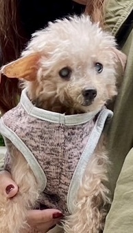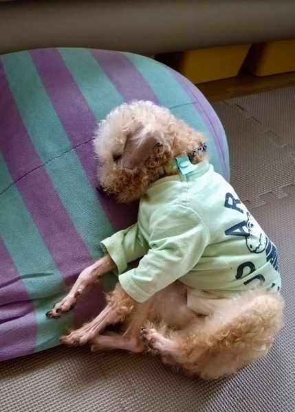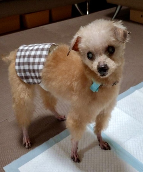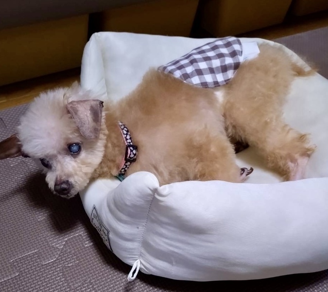 | 特徴(性格など) | なると君 推定年齢12歳 トイプードル アプリコット 男の子 体重3キロほどの小さな子 甘えん坊です。 誰かが近くにいないと、さみしくなっちゃいます。 ご飯の時は、そばにいてお手伝いしないと食べない甘えん坊さんです。 (歯がほぼないため、不安なのかもしれませんね) 食後は、のどに詰まらないよう、背中トントン→ゲップと、赤ちゃんみたいです。 そんな調子で、 まると君独特のお世話もありますが、 基本的によく寝て、 マナーパットでおしっこして、 トイレシートでウンチする・・・ そして、また寝る・・・・ そんななると君です。 2024年3月の保護時はひどく痩せて、脱毛もひどく、なぜ、こんな状態で… と悲しくなりました。 様々な工夫や、フードもあれこれ試し、やっと食べれるようになってきました。 |