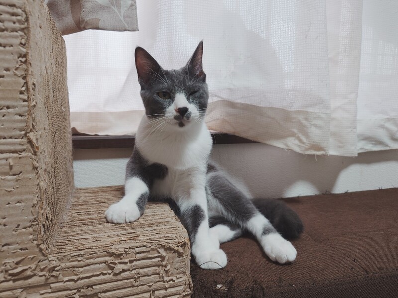 | 特徴(性格など) | 2024.6.30生まれ(推定) 毛色:白グレー お鼻と口元の模様が四つ葉のクローバーに見えなくもない・ぬるを。 いつもちょっとビックリ顔な男の子。 慎重派なのか人のことをよく観察しています。 食いしん坊なので、兄妹の中で1番大きいムチムチボディの持ち主です♪ 子猫なのですが、時々オジサンのように見えることがあってかわいいです笑 見た目もよく似た ほへと とニャンプロして毎日盛り上がっています! |