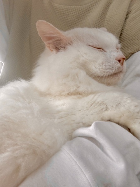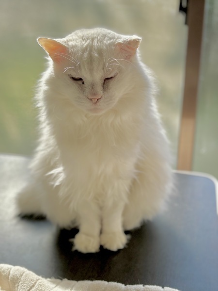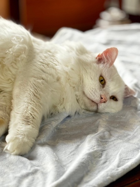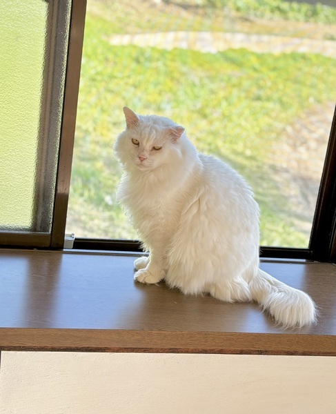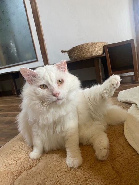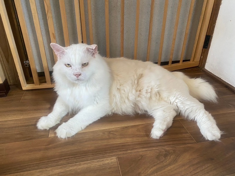 | 特徴(性格など) | 9歳くらいの男の子で、白長毛の長しっぽです。温厚で人にも他猫にも友好的。おもちゃで遊ぶのも大好きです。 歯はほとんどありません。 エイズ陽性で、腎臓の療法食です。 |