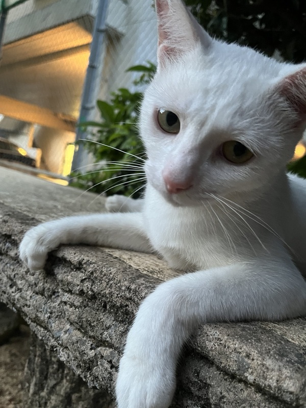 | 特徴(性格など) | 野良猫では珍しい真っ白な猫ちゃんです。 野良猫で会う確率は僅か3%。 とっても賢くて優しくて近所の子供ともよく遊びます。 |