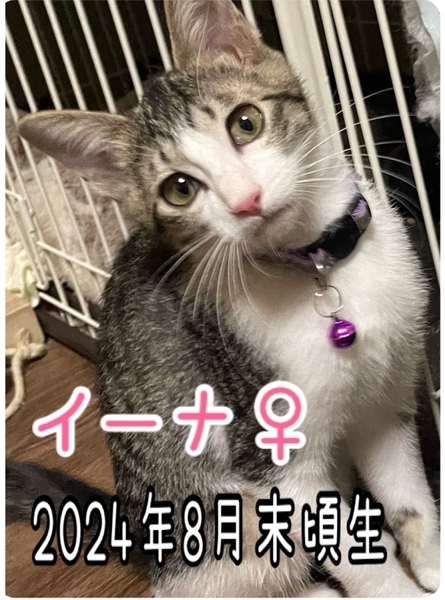 | 特徴(性格など) | キジシロ 食欲旺盛、すくなれます。 抱っこOK エイズ・白血病、共に陰性 ニータ♂、サーナ♀、シーナ♀、ゴンタ♂ と兄弟です。 |