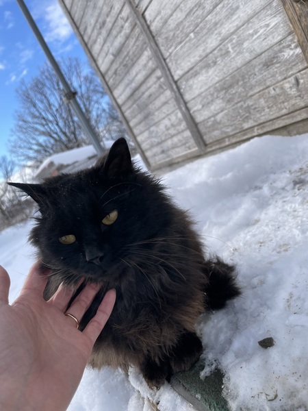 | 特徴(性格など) | 黒い体に、背中が白いたぬき柄です。 牧場の牛舎内で生まれたのでずっと外猫ですが、人慣れしており触らせてくれます。 抱っこもさせてくれます。 生まれつき、しっぽがカギ状に曲がっています。 |